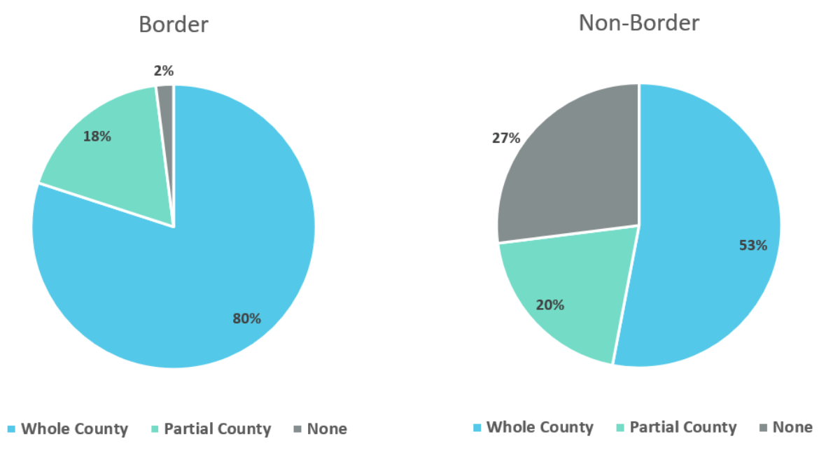 Texas Border counties were more likely than other counties in the border states to be whole- or partial county dental care health professional shortage areas (DHPSA). Only one border county had no shortage indicator for dental care, versus 27.2% among non-border counties. Conversely, 79.6% of border counties, versus 52.5% of other counties, were whole-county DHPSAs.