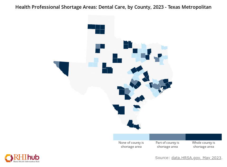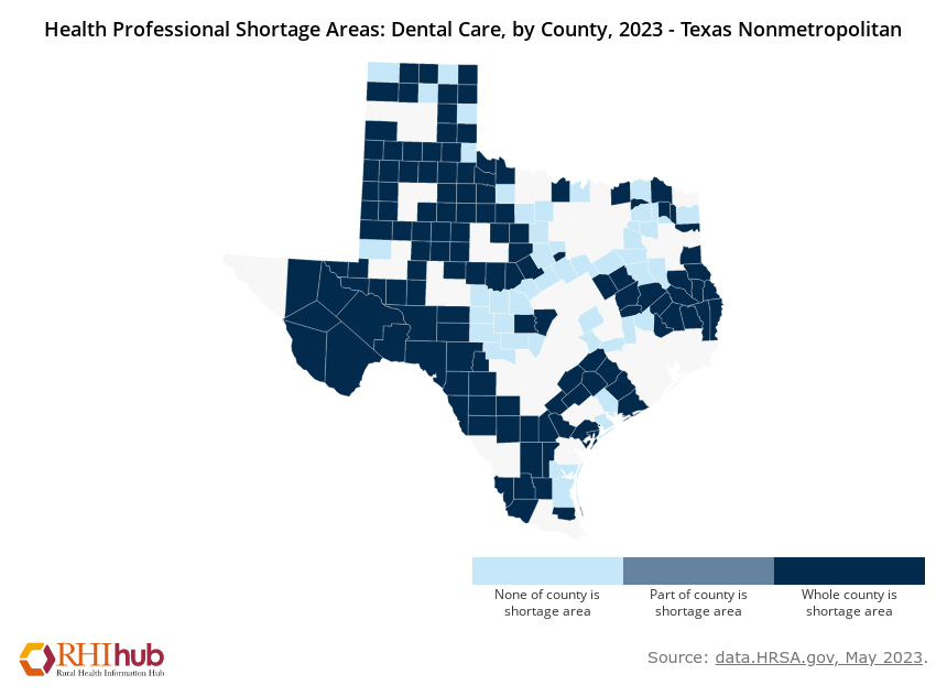 Health Professional Shortage Areas: Data are from the Rural Health Information Hub, Health Professional Shortage Areas: Dental Care, by County, 2023 - Texas the data source is data.HRSA.gov, May 2023. Border data are from the Rural and Minority Health Research Center's 2021 Rural Border Health Chartbook.