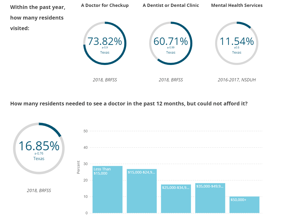 Health Care Provider Visits: Data about dentist and doctor visits are from the CDC's Behavioral Risk Factor Surveillance System (BRFSS). Data about mental health service visits are from the National Survey on Drug Use and Health, conducted by the Substance Abuse and Mental Health Services Administration. Border data are from the Rural and Minority Health Research Center's 2021 Rural Border Health Chartbook.
