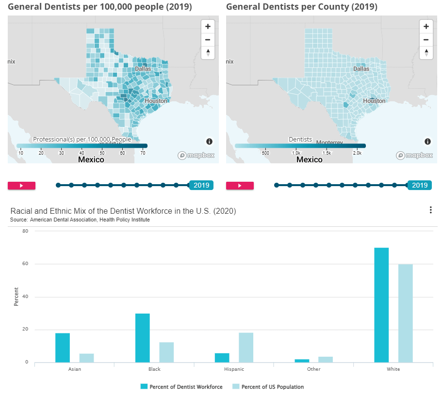 Health Care Workforce: Shortage/Surplus and data are from Texas Health and Human Services Supply and Distribution Tables for State-Licensed Health Professions in Texas. Supply of Dentists and Dentist demographic data are from American Dental Association, Health Policy Institute (ADA HPI) Supply of Dentists in the U.S., 2001-2022 (XLSX) report and the ADA HPI US Dentist Demograhic Dashboard. Dentist supply data are from Texas Health and Human Services Supply and Distribution Tables for State-Licensed Health Professions in Texas.
