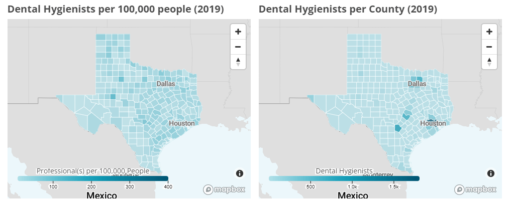 Many of the dental hygienists in Texas are near the Houston and Dallas areas. However, compared to the population (per 100,000 people), the ratio of dental hygienists (per 100,000 people) are greater in the eastern region of the state.