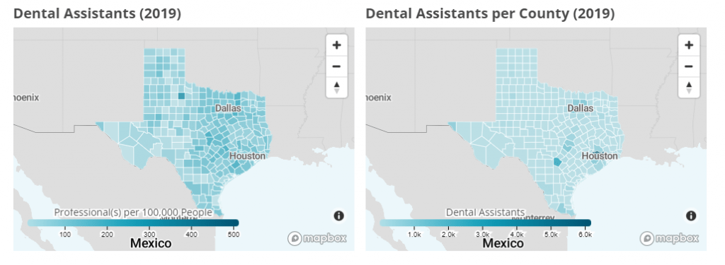 Many of the dental assistants in Texas are near the Houston and Dallas areas. However, compared to the population (per 100,000 people), the ratio of dental assistants (per 100,000 people) are greater in the eastern region of the state.
