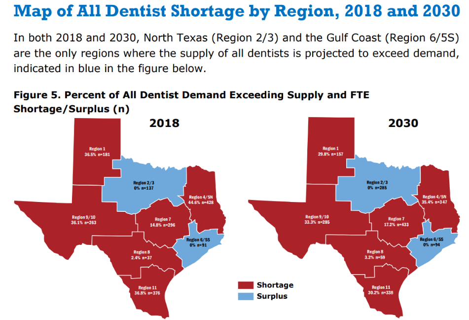 Health Care Workforce: Shortage/Surplus and data are from Texas Health and Human Services Supply and Distribution Tables for State-Licensed Health Professions in Texas. Supply of Dentists and Dentist demographic data are from American Dental Association, Health Policy Institute (ADA HPI) Supply of Dentists in the U.S., 2001-2022 (XLSX) report and the ADA HPI US Dentist Demograhic Dashboard. Dentist supply data are from Texas Health and Human Services Supply and Distribution Tables for State-Licensed Health Professions in Texas.