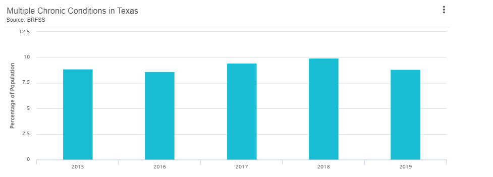 Multiple chronic conditions is defined by BRFSS as the “percentage of adults who have three or more of the following chronic health conditions: arthritis; asthma; chronic kidney disease; chronic obstructive pulmonary disease; cardiovascular disease (heart disease, heart attack or stroke); cancer (excluding skin); depression; diabetes.”